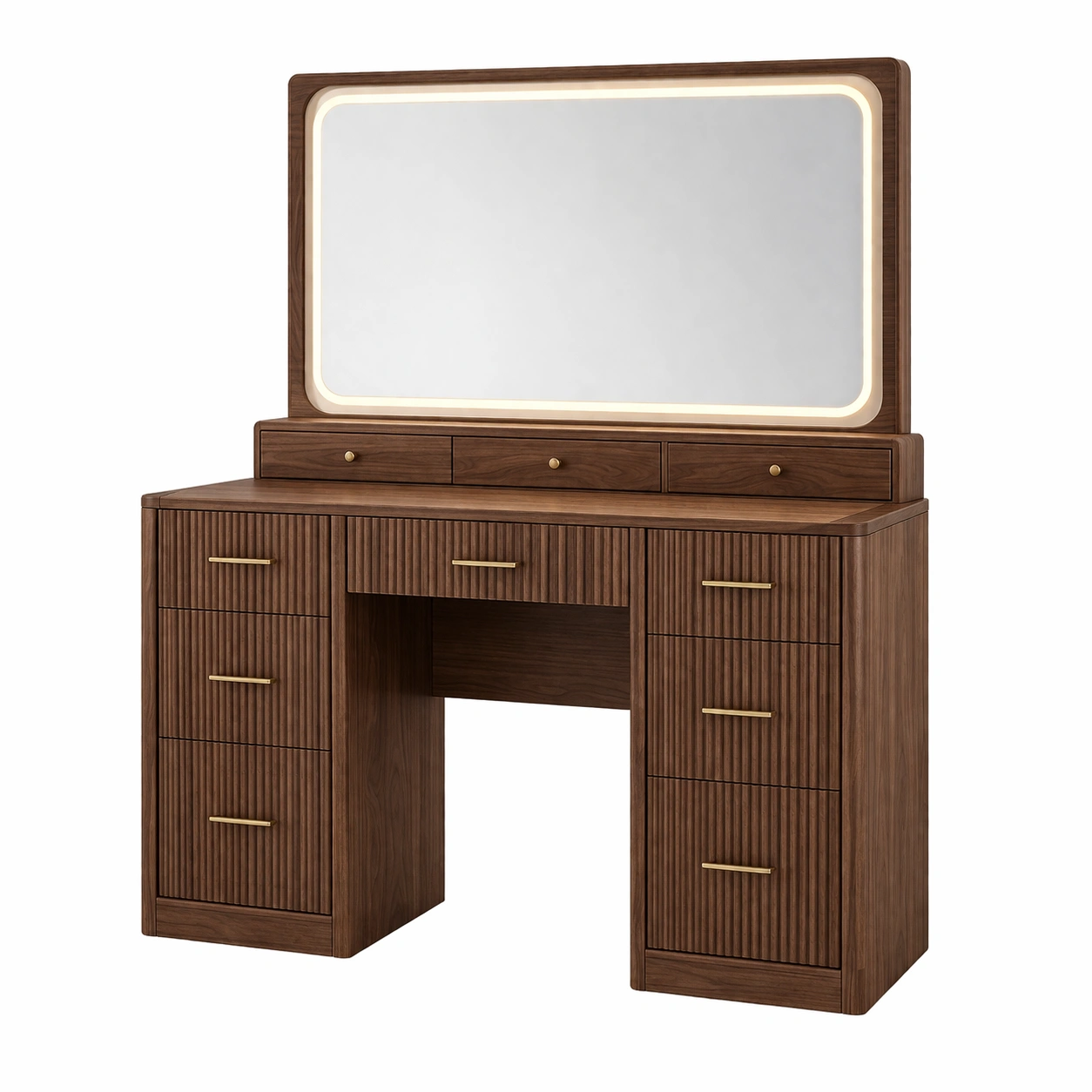 Este tocador está fabricado con madera de nogal e incluye un espejo grande con iluminación LED integrada.